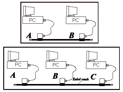 - Sekiranya terminator dipasang dengan betul, kecilkan sistem rangkaian kepada dua buah komputer. Sila Rujuk rajah 3. Sekiranya sistem rangkaian pulih seperti sediakala, lakukan penambahan komputer satu persatu sehinggalah kita dapati berlakunya kepincangan dalam sistem rangkaian. Sebagai contoh: Sekiranya kita tambah komputer dari dua kepada tiga dan kita dapati berlakunya kepincangan dalam sistem rangkaian. Maka kabel RG58 yang menyambung dari komputer nombor B dan C telah rosak. Kita hanya perlu menukar kabel yang menyambung komputer B dengan Komputer C. Tetapi perlu di ingatkan bahawa setiap kali kita menambah komputer, terminator 50 ohm perlu di pindahkan kepada penghujung kabel di komputer yang pertama dan yang terakhir.